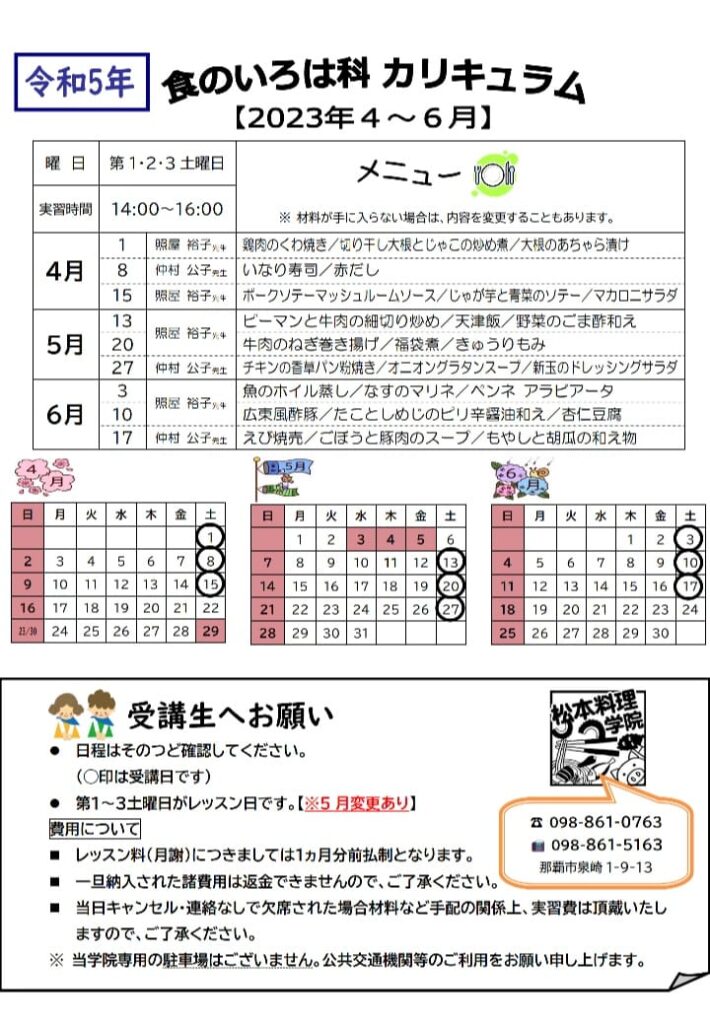 | 土曜日 14:00~16:00 | 照屋 裕子 先生(第1,2週)、仲村 公子 先生(第3週) | ✕ | △ | △ |
